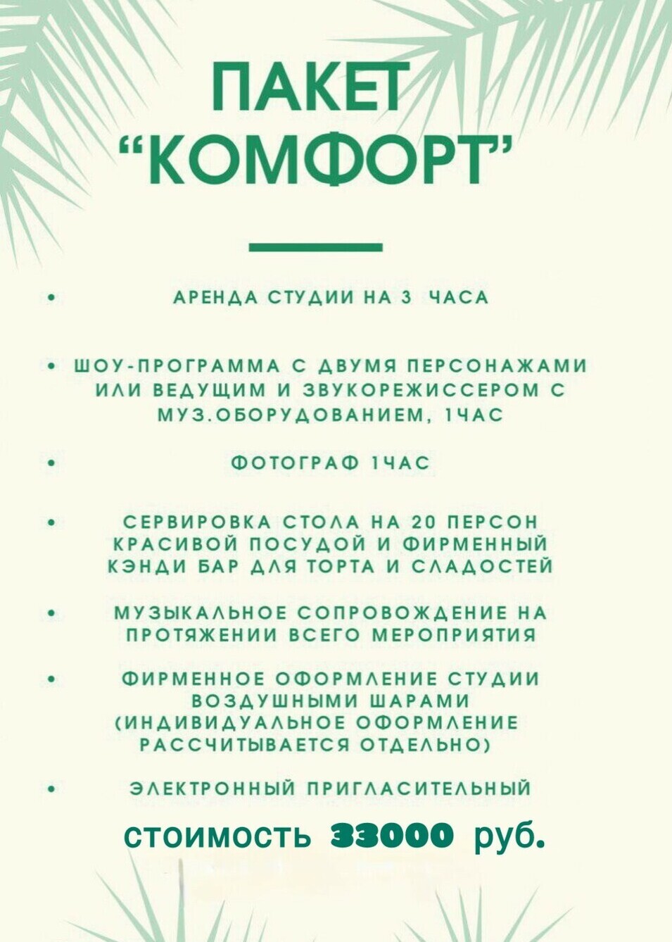 3. Комфортная вместимость студии: 20 человек (дети и взрослые). Допустимая: 25. Свыше + 500 руб./1 человек. Допустимое кол-во детей: не более 12 человек.